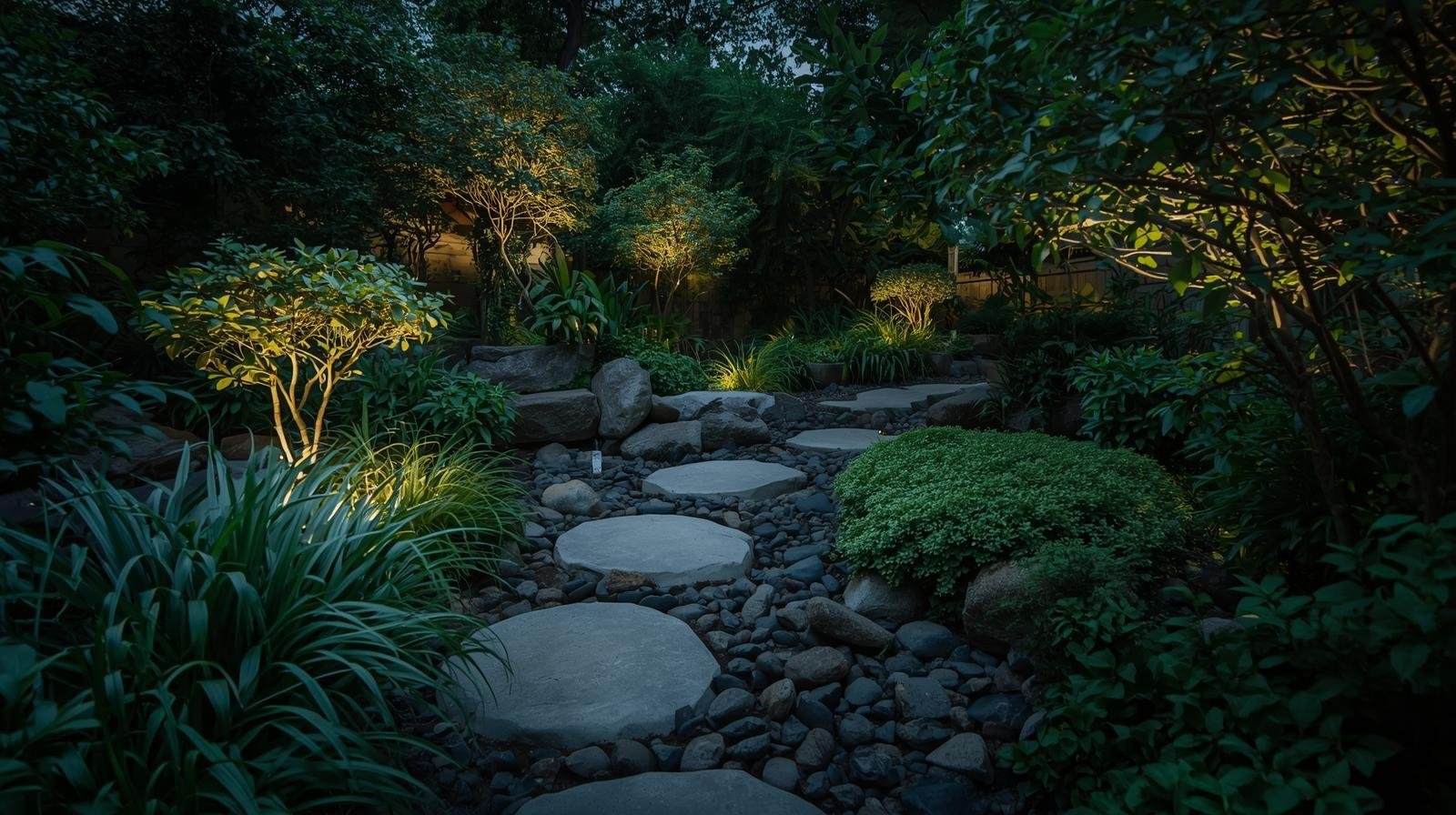 Pedras e Luzes na Decoração Verde do Jardim